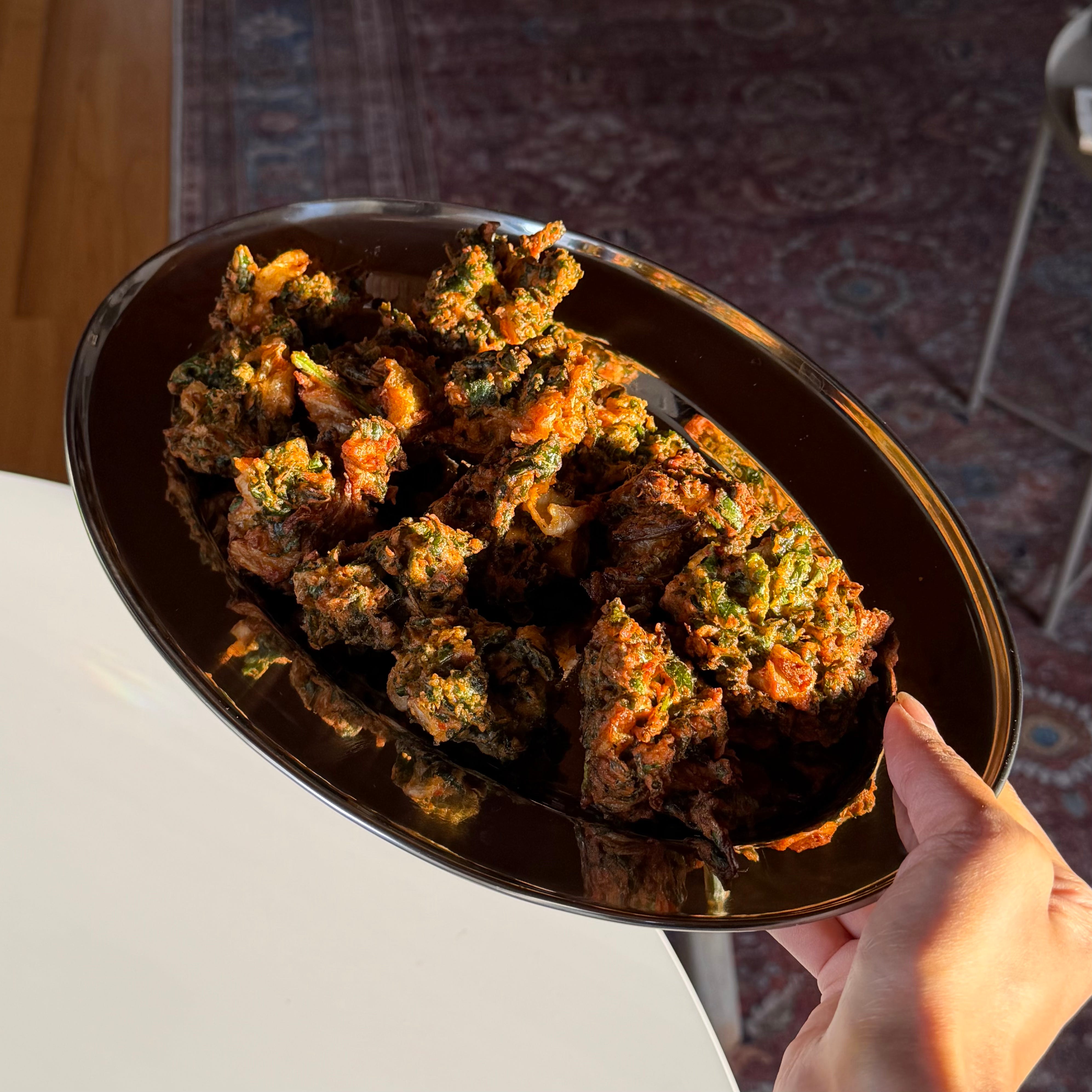 After every pakora that comes out, hit them with a sprinkle of chaat masala right away!